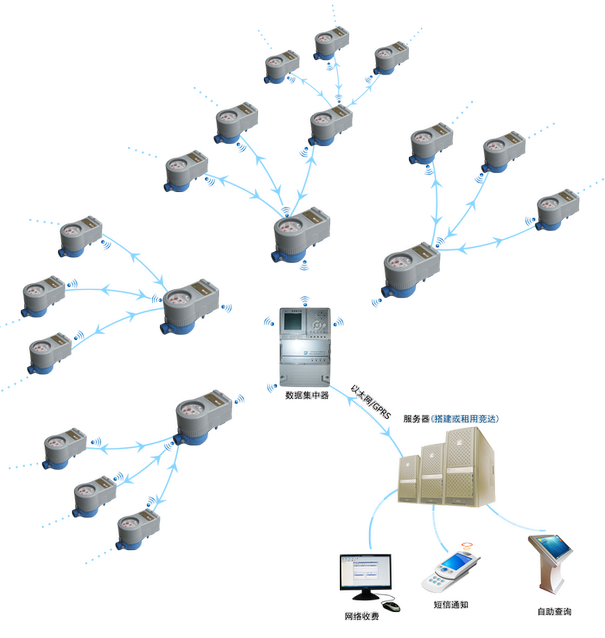 未來是移動互聯(lián)的時代,手機移動終端和物聯(lián)網(wǎng),也將融為一體發(fā)展。物聯(lián)網(wǎng)技術(shù)的水電氣表,可以直接通過手機繳納;家中水電氣表一旦漏水、漏電、漏氣,通過水電氣表上的傳感器,會自動發(fā)短信到用戶手機上。這種以物聯(lián)網(wǎng)的方式能效管理將有望在全國重點城市逐步實施。20年來一直專注于計量表具智能化的競達公司,是國內(nèi)率先發(fā)力物聯(lián)網(wǎng)智能化水表研發(fā)的企業(yè)之一,是智能水表進入e時代的代表企業(yè)。在智慧城市概念及物聯(lián)網(wǎng)概念還鮮為人知的情況下,就已開發(fā)出國內(nèi)領(lǐng)先的各種智能卡式水表,引領(lǐng)著國內(nèi)智能水表的發(fā)展。伴隨著智慧城市和物聯(lián)網(wǎng)概念的普及,競達已開始未雨綢繆,秉承“生產(chǎn)一代,研發(fā)一代,儲備一代,醞釀一代”的產(chǎn)品規(guī)劃思路,已陸續(xù)推出適用于物聯(lián)網(wǎng)平臺的智能水表,包括:電子直讀式遠傳遠控型、光電直讀式遠傳型、無線遠傳水表及智能遠傳大口徑水表等系列產(chǎn)品,上述產(chǎn)品通過數(shù)據(jù)集中器將數(shù)據(jù)信息以GPRS或以太網(wǎng)方式遠傳(如圖),實現(xiàn)了數(shù)據(jù)無線遠傳、無線管理的功能,具體包括: